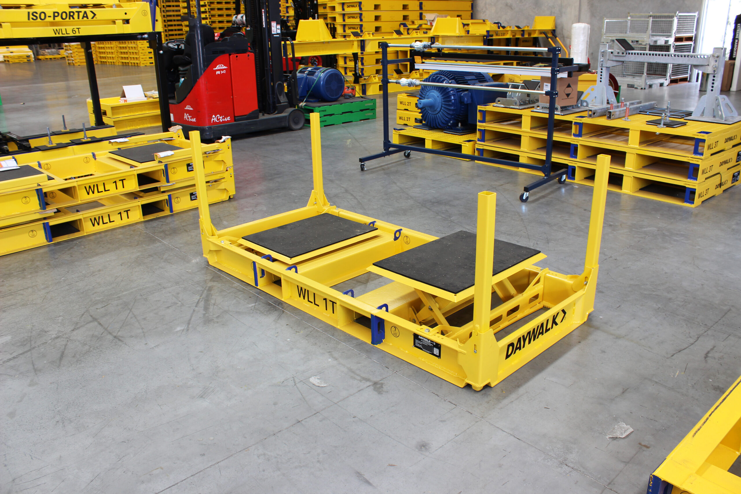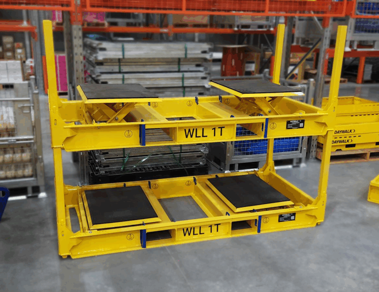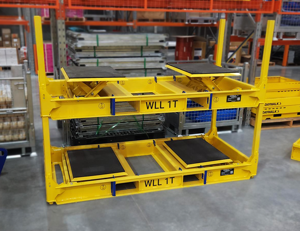 | Includes | 2 high friction rubber pads 2 adjustable platforms Certified for stacking 2 high in storage |
